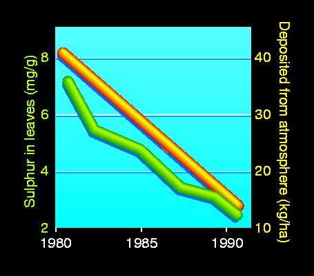 Symptoms of sulphur deficiency are also starting to show up in other crops. Grain crops thrive on less sulphur than rape. But as sulphur deposits in soil are used up, they too are beginning to show signs of distress. This summer, Schnug and his colleagues found that adding sulphur could increase wheat and barley yields in northeast Germany by as much as 20 per cent. He believes sulphur deficiency is also one of the reasons why some European forests are stil dying, despite the reduction in acid rain (see Graph).
