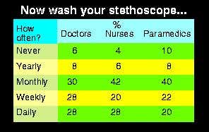 Jeffrey Jones and his colleagues at Michigan State University’s College of Human Medicine in Grand Rapids, Michigan, asked 50 doctors, 50 nurses and 50 ambulance paramedics how often they cleaned their stethoscopes. Seventy-five per cent of them cleaned their stethoscopes less than once a day, while 6 per cent said they had never cleaned their stethoscopes at all. “When we talked with them, they couldn’t recall ever being told that they should wash their stethoscopes,” says Jones.