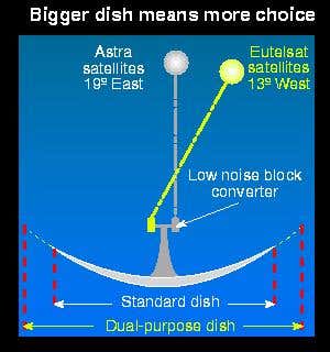 Conventional dish aerials cannot receive signals from both satellites. They have an electronic device called a low noise block converter at the focal point, and when the dish is pointed at Astra, the LNB receives nothing from Eutelsat. But if two LNBs are mounted side by side and slightly offset from the focal point, one will receive signals from Astra and the other from Eutelsat.
