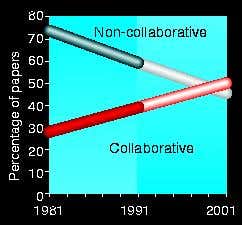 Over the 11 years, the team found that a paper’s authors were increasingly likely to come from several institutions. In 1981, only 28 per cent of the publications listed authors from more than one establishment. By 1991 that figure had risen to 41 per cent.