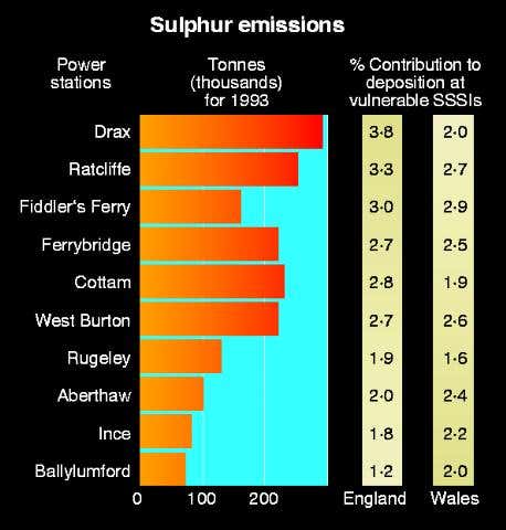 The league table is the result of a study that plotted the fate of the sulphur dioxide emissions from individual power stations. The aim was to see how much of the sulphur eventually rains onto SSSIs where the sulphur fallout exceeds the “critical load” at which it does biological damage. The league table shows what proportion of the acid fallout on vulnerable SSSIs comes from which power stations. SSSIs cover a tenth of Britain. In England, 38 per cent of SSSIs receive more acid rain than they can cope with; in Wales the figure exceeds 60 per cent.