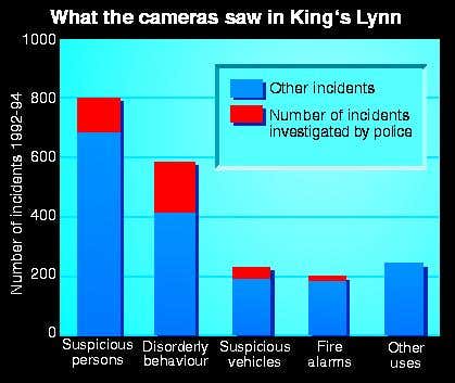 King’s Lynn has one of the most extensive CCTV schemes in the country: 60 cameras, soon to be supplemented by a further 30. Between 1992 and 1995 the camera operators picked up two thousand incidents (see Diagram). The police considered only 16 per cent of them worth investigating. As Pease points out, different people interpret things in different ways. One person’s boisterousness is another’s riot.