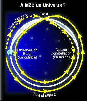 The way to tell if the Universe is “multiply connected” like this is to look in different directions on the sky at objects hundreds of millions of light years away. Quasars are about the only things bright enough and distant enough to fit the bill. If you see the same geometrical pattern in different directions (not necessarily in opposite directions, because the Universe may be crumpled as well as toroidal), you will know that it is indeed multiply connected (see Diagram).FIG-mg20632401.GIF