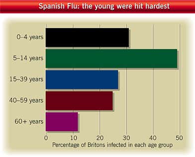 Graham Winyard, who is medical director of Britain’s National Health Service Executive, wrote a letter accompanying the action plan warning regional health authority officials that flu pandemics often hit those age groups least affected by normal influenza. Spanish Flu brought down young, fit people: 27 per cent of 15 to 39-year-olds were affected, compared with 12 per cent of the over-60s. The result, he suggests, would be widespread disruption of health services.