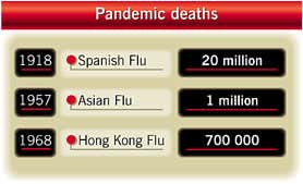 A look at the medical statistics of past pandemics underlines the sheer magnitude of the threat that a new strain of flu can pose. In Britain, studies suggest that nearly a quarter of the population became ill with Spanish Flu. Asian Flu affected 17 per cent and the most recent pandemic, Hong Kong Flu, made around 8 per cent of the adult population sick, despite the use of vaccines in both cases. The WHO is thought to be basing its pandemic action plan on the presumption that 25 per cent of the world’s population would be stricken.
