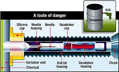 and pierces a “vacutainer”—a vacuum-filled device normally used for taking