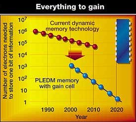 Called Phase-state Low Electron-number Drive Memory (PLEDM), the new technology is the brainchild of a team at the Hitachi Cambridge Laboratory-a joint research venture of Hitachi of Tokyo and Cambridge University. At the very least, PLEDM chips should have twice the data-storage capacity of conventional dynamic RAM chips-and as chip-making processes improve, they should be able to squeeze in even more, says David Williams, group leader at the laboratory.