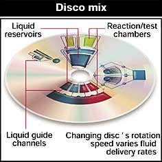 the size of a CD. When the disc spins, microlitres of fluid are forced through