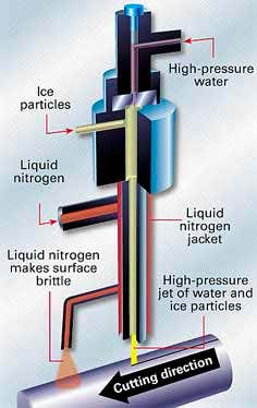 Instead of abrasive particles, however, they cool a spray of water droplets to create tiny ice particles about a quarter of a millimetre wide. These ice crystals are injected into a stream of water, which is then forced out of a millimetre-wide nozzle (see Diagram) at pressures that can reach 3700 atmospheres. A jacket of liquid nitrogen keeps the nozzle assembly cold.