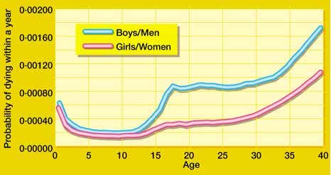 Men are more likely than women to die at any age throughout the whole of their lives. The shape of the graph and, in particular, the surge of male deaths around the time of adolescence, points to some of the key factors…