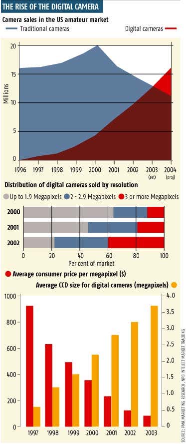 Perhaps most significantly, the size and cost of digital cameras are spiralling downward in unison (see Diagram). Meanwhile their resolution – determined by the number of pixels in the light-sensitive CCD array that acts as the camera’s digital “film” – has rocketed. The first consumer digital cameras had about 300,000 pixels, but these days even cameras in mobile phones can have 3 million pixels (3 megapixels), while professional cameras have upwards of 16 megapixels, more than enough to match the resolution of film.