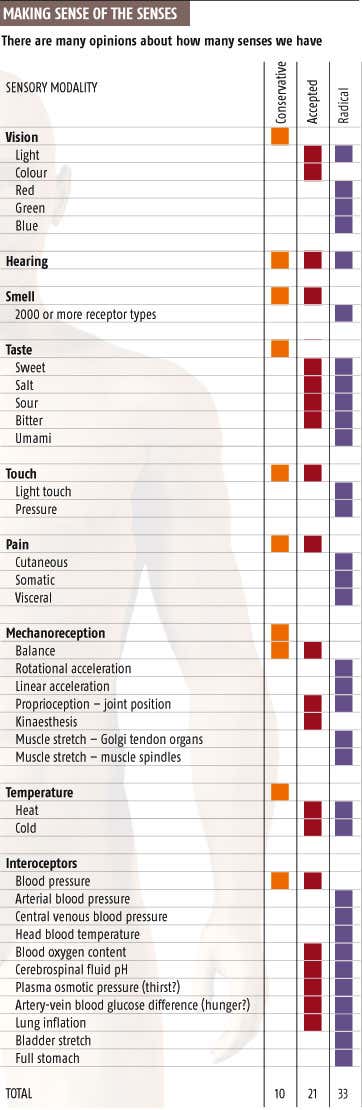 While schools still teach us that there are five senses – an idea that came courtesy of Aristotle and permeates popular culture – the count is at odds with science. Try grabbing an ice cube with one hand and a red-hot poker with the other, and tell me that what you feel can be encompassed by the favourite five. Go on a white-knuckle ride at any theme park and convince me that everything you experienced was down to sight, sound and touch. You probably had your eyes closed anyway. There is clearly more to sensation than these five categories. So how many senses do we have?