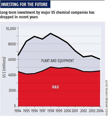 WITH a single advertising slogan in the 1930s – “Better Things for Better Living…Through Chemistry” – US giant DuPont captured the public’s attention and defined the heyday of a science. But those words have lost their impact today, and the chemistry sector has been having a hard time recently. Annual capital spending by major US chemistry companies has dropped by a third since 1998, and R&D spending has declined, according to the American Chemical Society (see Graph).