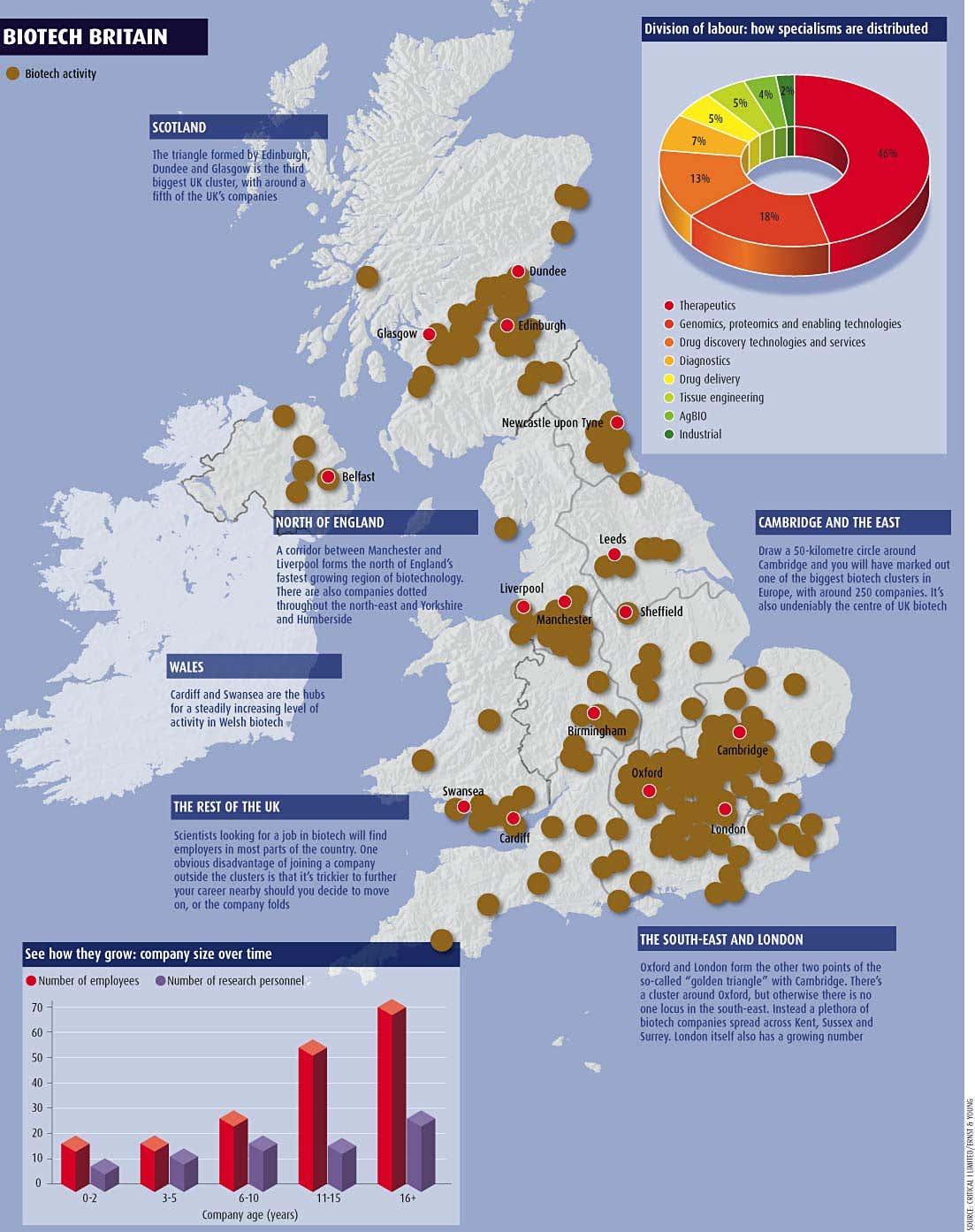 Working for one of these start-ups can be exhilarating, but is not for the faint-hearted. While you have a fabulous opportunity of seeing and working in just about all departments of a company, forget long-term security. The only consolation is that if your company is in a big biotech cluster such as the one near Cambridge, you can find a new job nearby if it folds (see “Biotech Britain”).