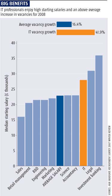 “Computer science graduates are able to think for themselves and solve problems, so they are flexible in whatever job they find themselves,” says Nick Pears, admissions tutor in the Department of Computer Science at the University of York, one of the highest-rated departments in the country. IT and computer science degrees are well regarded by potential employers, he says. “The job prospects are much better than people think. The dotcom bust of five years ago created a bit of a negative environment, but because of that there is a shortfall of job candidates, which means that job prospects are fantastic” (see Chart).