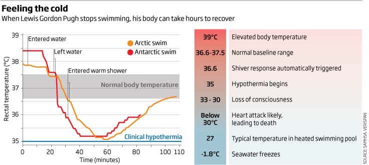 Most of us would start to hyperventilate uncontrollably if we dived into such cold water. Pugh doesn’t even gasp in pain but instead starts swimming. In December 2005, when Pugh took this plunge (pictured above), he went on to swim a kilometre in just over 18 minutes. Many ordinary people would drown after just a few minutes in such cold water. Pugh, however, not only survived but went on to make several more long-distance swims in extremely cold water (see graph). So what makes him able to keep swimming in such extreme cold?