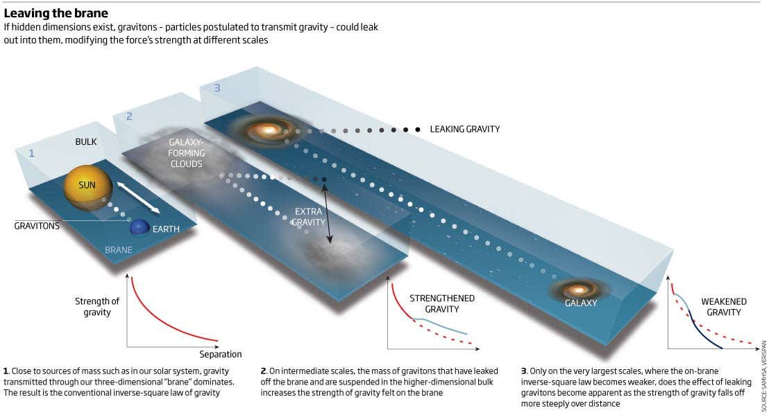 Or will they? Justin Khoury, now of the University of Pennsylvania in Philadelphia, and his colleagues Niayesh Afshordi and Ghazal Geshnizjani of the Perimeter Institute for Theoretical Physics in Waterloo, Ontario, are not so sure. They have listed a series of cosmological observations that cannot readily be explained with a one-size-fits-all gravity (www.arxiv.org/abs/0812.2244). None of these effects on its own, they stress, necessarily indicates anything amiss. But intriguingly, all of them melt away if you make just one assumption, albeit a controversial one: that how gravity works depends on the scale on which you look at it.