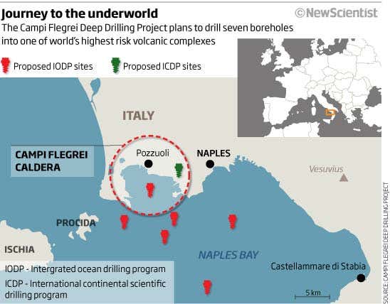 Will we see the next disaster coming? That’s one of the questions an ambitious drilling project hopes to answer by sinking boreholes into Campi Flegrei, as the giant collapsed volcanic crater is now called. Starting as early as next month, the Campi Flegrei Deep Drilling Project is planning to drill seven holes in the region (see map).