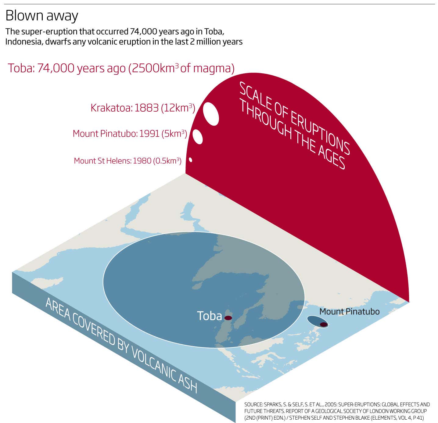 Toba is a supervolcano on the Indonesian island of Sumatra. It has blown its top many times but this eruption, 74,000 years ago, was exceptional. Releasing 2500 cubic kilometres of magma – nearly twice the volume of mount Everest – the eruption was more than 5000 times as large as the 1980 eruption of mount St Helens in the US, making it the largest eruption on Earth in the last 2 million years (see “Blown away”).