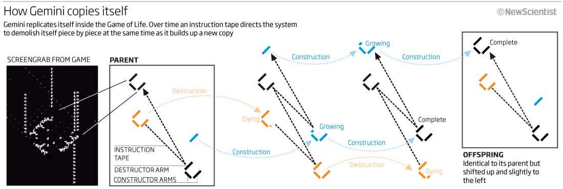 Gemini’s implications extend to the real world. “There’s a fascination with the complexity that is coming out of these incredibly simple rules,” says Susan Stepney, a computer scientist at the University of York, UK, who ran Gemini inside Life, at New Scientist‘s behest. “Eventually that leads on to biology, putting simple atoms together to make complex life.”