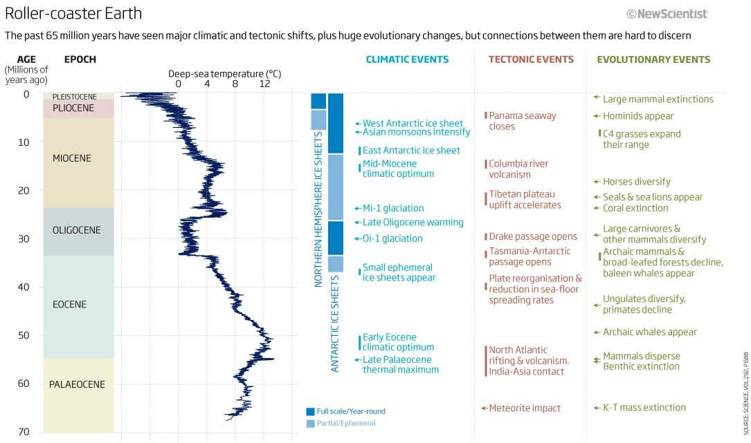 Our understanding of global environmental change is vastly more detailed than it was in Lyell and Darwin’s time. James Zachos at the University of California, Santa Cruz, and colleagues, have shown that the Earth has been on a long-term cooling trend for the past 65 million years (Science, vol 292, p 686). Superimposed upon this are oscillations in climate every 20,000, 40,000 and 100,000 years caused by wobbles in the Earth’s orbit.