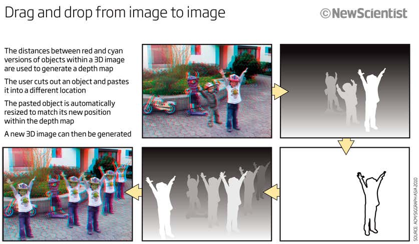 Packages like Adobe’s Photoshop make it easy to copy and paste objects from one 2D computer image to another. But until now there has been no way to edit the stereoscopic images shot by 3D cameras because of the different “depths” of the elements within the 3D pictures.