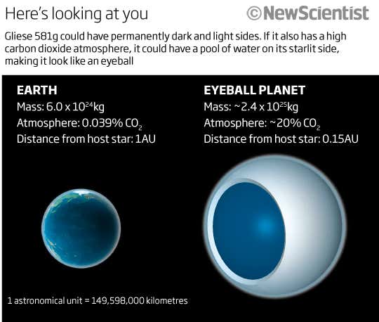 Raymond Pierrehumbert at the University of Chicago examined the range of climates that Gliese 581 g might have and found one that would have a pool of water on one side, making it look like an eyeball. Even if further observations disprove the existence of Gliese 581 g, the work could help determine the habitability of exo-Earths still to be discovered.