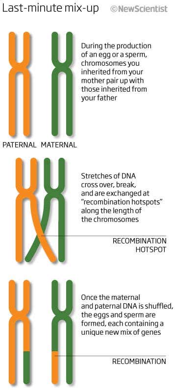 That gene is at the heart of a crucial but seemingly irrelevant process called genetic recombination. During the production of eggs and sperm, chromosomes pair up, cross over and swap segments of DNA, mixing the genes you inherited from your mother and father (see diagram). This shuffling of the genetic pack is the source our individual uniqueness. But no one suspected that recombination might also play a role in generating new species.
