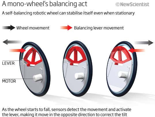 Previous efforts to create a mono-wheel that is stable when stationary, like the Gyrover, developed by Ben Brown at Carnegie Mellon University in Pittsburgh, Pennsylvania, have a second wheel that spins within the first to act as a gyroscope. But this uses a lot of energy.