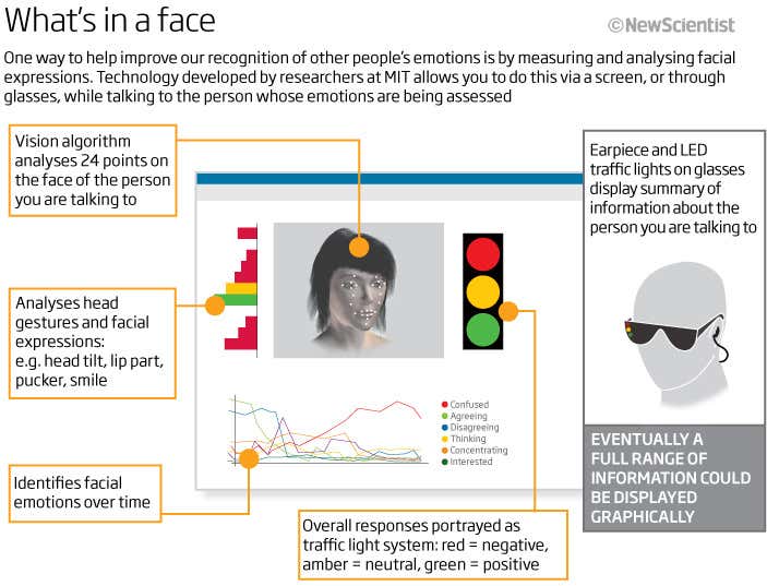 The glasses can send me this information thanks to a built-in camera linked to software that analyses Picard’s facial expressions. They’re just one example of a number of “social X-ray specs” that are set to transform how we interact with each other. By sensing emotions that we would otherwise miss, these technologies can thwart disastrous social gaffes and help us understand each other better. Some companies are already wiring up their employees with the technology, to help them improve how they communicate with customers. Our emotional intelligence is about to be boosted, but are we ready to broadcast feelings we might rather keep private?