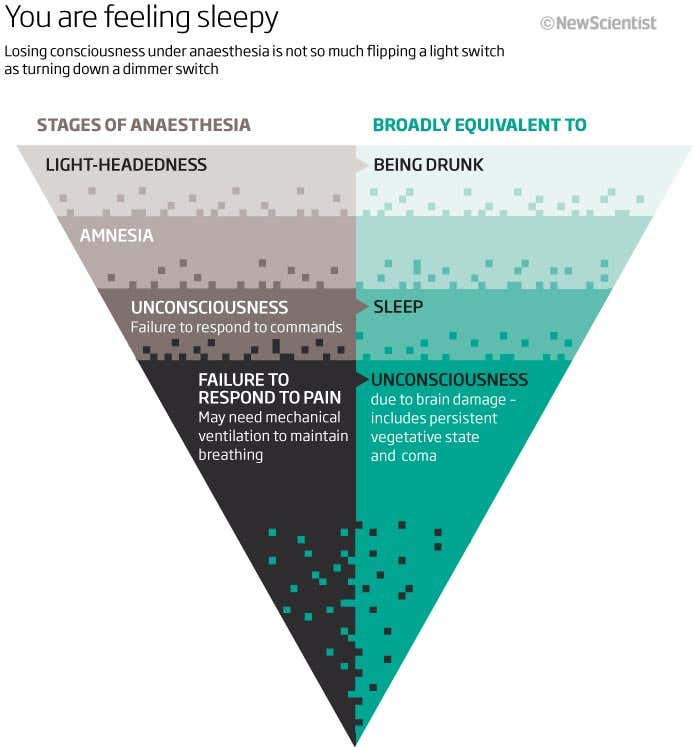 Consciousness may often be thought of as an all-or-nothing quality – either you’re awake or you’re not – but as I experienced, there are different levels of anaesthesia (see diagram). “The process of going into and out of general anaesthesia isn’t like flipping a light switch,” says Mashour. “It’s more akin to a dimmer switch.”