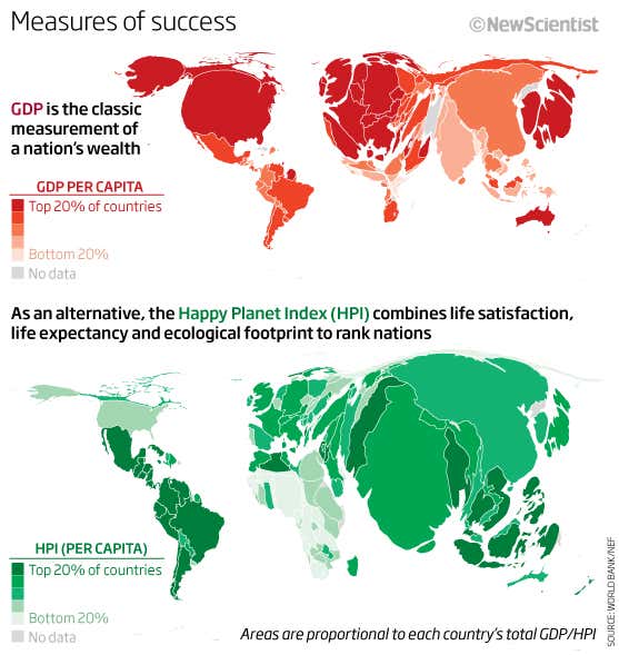 To show how different the world looks when viewed according to the HPI, rather than conventional wealth, New Scientist applied distorting lenses. In the top map, countries are sized according to their GDP, and shaded by GDP per capita. As sub-Saharan Africa almost shrinks from view, western Europe, the US and Japan swell and flush a deep red.