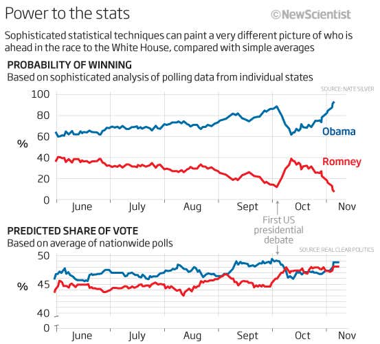 Obama’s win alone does not validate Silver’s techniques. Nor would a Romney win have disproved him, as his final figures showed a 10 per cent chance of the race going the other way. Still, there’s no doubting the accuracy of his method.