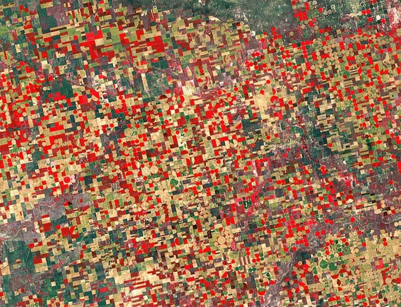 In this false-colour image, taken last year, circles and rectangles represent different types of irrigation systems. The town of Ulysses is in the centre-right, and the Cimarron river interrupts the patchwork in the bottom-right.