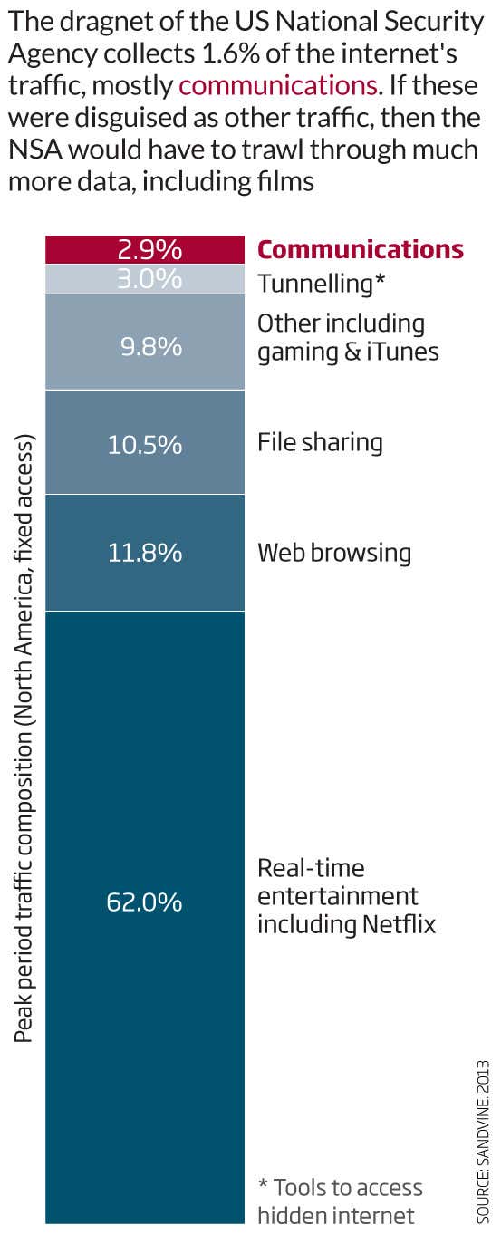 But the dragnet may be about to come crashing to a halt. A rising tide of frustration with NSA policies has led technologists to build tools to hide internet traffic in plain sight. If implemented widely, they could send government spy programmes packing, along with anyone who seeks to filter or censor information online.