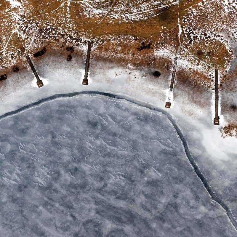 The image at the very top shows a stream snaking through a snow-covered field dotted with trees. It’s in contrast to the image just above: Kowalski thinks this thin black ribbon, at the edge of a lake, is human made. Bordered by what look like piles of snow, it is probably a path dug by ice fishers to make crossing the ice easier. In the image below, the black lines are once again natural, the result of water seeping up through splits in the ice on a lake.