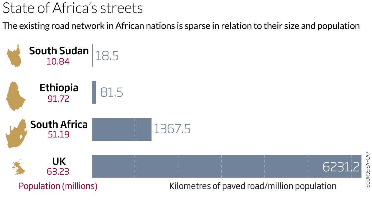 The need for infrastructural change is undeniable. Compared with the world average, Africa’s existing road network is sparse and poorly maintained. According to a report for the World Bank, average road density on the continent is 204 kilometres of road per 1000 square kilometres of land area – only a quarter of which is paved. In contrast, the world average is 944 kilometres per 1000 square kilometres with more than half paved. This is partly due to Africa’s vast area, but its roads look sparse even when viewed by population (see diagram).