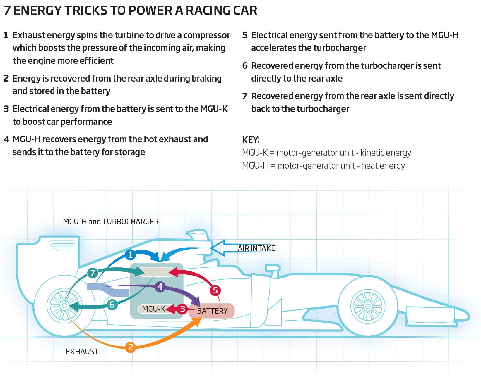 The heart of the 2014 power unit is the newly shrunk engine that has also had its maximum rotational speed cut from 18,000 revolutions per minute to a more efficient 15,000 rpm. Then a raft of energy-recovery techniques come in to play (see diagram, below).