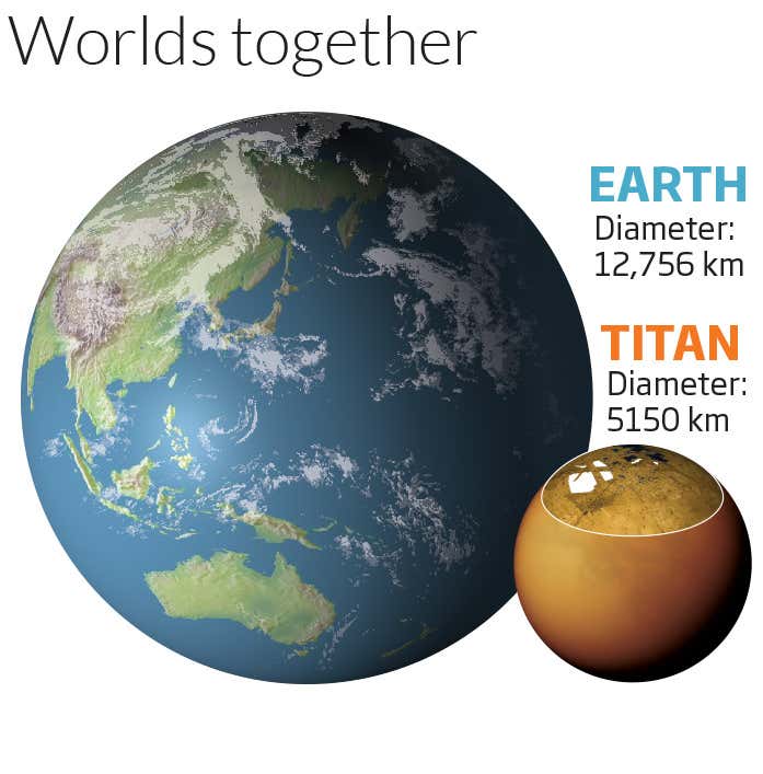 A sea of liquid methane laps a shore of solid ice as the biggest rainstorm ever falls from an orange sky. Welcome to Saturn’s largest moon