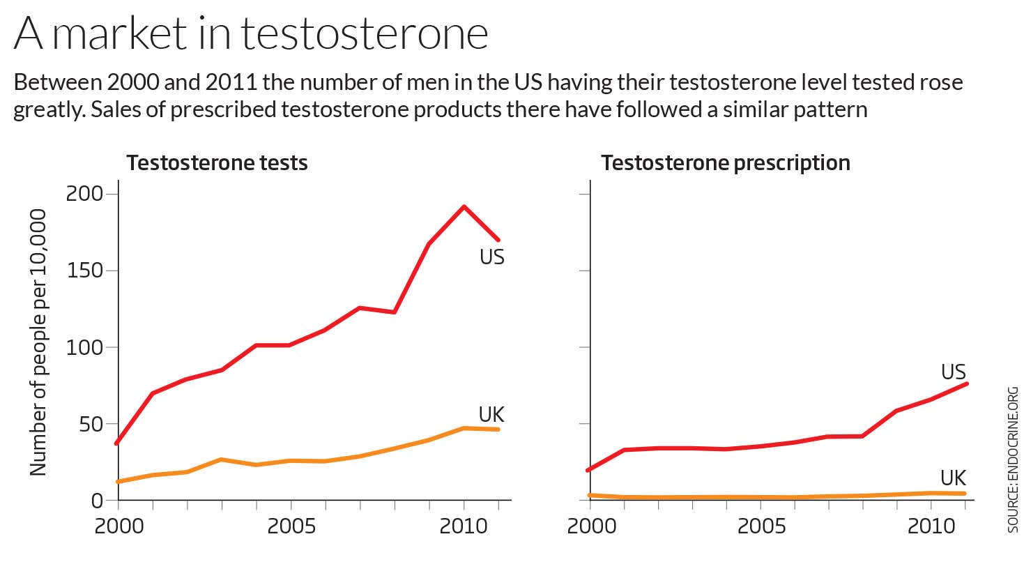 Between 2000 and 2011, prescriptions for testosterone supplements in the US more than quadrupled (see graph) and in 2011 an estimated 5.3 million prescriptions were issued. Although nowhere near US figures yet, sales of testosterone supplements in the UK, Australia and Germany are also on the increase.