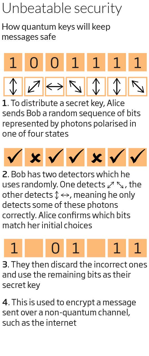 Eventually though, Hayford says repeaters could bring QKD to ordinary internet users. You won’t have a direct optical fibre link to your home, but will instead visit a kind of quantum post office that is plugged in to the network. There, you’ll pick up a memory stick filled with quantum codes to use with Google, Amazon and other internet companies on your home PC or smartphone. Such quantum keys could even travel via the undersea cables that the internet uses today – though installing repeaters at the bottom of the Atlantic will be a challenge, says Saikat Guha of BBN Technologies in Cambridge, Massachusetts.