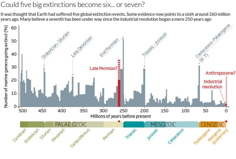 As for the next big die-off, it is probably already under way, thanks to us. A working group set up by the International Commission on Stratigraphy (ICS) is pondering whether our current era should officially be named the Anthropocene, to reflect the profound impact of human activity. Keller, for one, is convinced by the extinction data coming in for modern species.