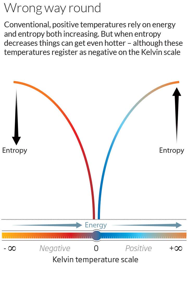 Or is it? It turned out later that temperature depends not just on particle energies, but how that energy is distributed: disorder, or entropy. Increasing entropy also implies heat flow – and temperature change. Because of the way Kelvin defined his scale, increasing a system’s energy while reducing its entropy registers as a negative temperature. In fact, there is a whole mirror world of negative temperatures stretching towards absolute zero from negative infinity (see diagram).