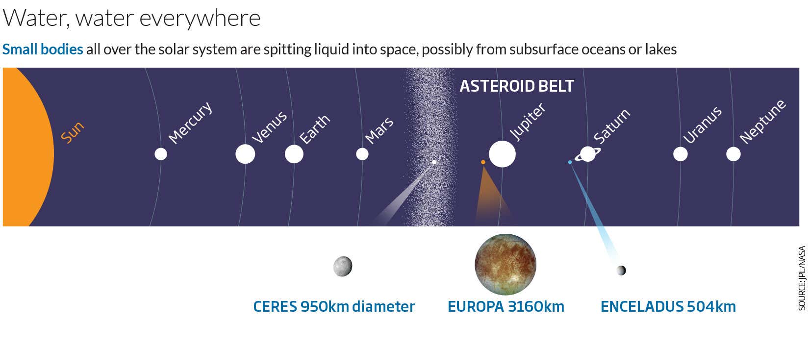 Remote observations using the Herschel space telescope show Ceres spitting water from somewhere on its surface, probably towards the equator. We think other icy bodies in the solar system, like Jupiter’s moon Europa and Saturn’s moon Enceladus, spew water in spectacular plumes from subsurface oceans (see diagram). If Ceres also has a buried sea, that could boost its chances of playing host to life – so astronomers are keen to track the plumes to their source.FIG-mg30143801.jpg