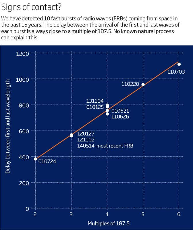 Michael Hippke of the Institute for Data Analysis in Neukirchen-Vluyn, Germany, and John Learned at the University of Hawaii in Manoa found that all 10 bursts’ dispersion measures are multiples of a single number: 187.5 (see chart). This neat line-up, if taken at face value, would imply five sources for the bursts all at regularly spaced distances from Earth, billions of light-years away. A more likely explanation, Hippke and Lerned say, is that the FRBs all come from somewhere much closer to home, from a group of objects within the Milky Way that naturally emit shorter-frequency radio waves after higher-frequency ones, with a delay that is a multiple of 187.5 (arxiv.org/abs/1503.05245).