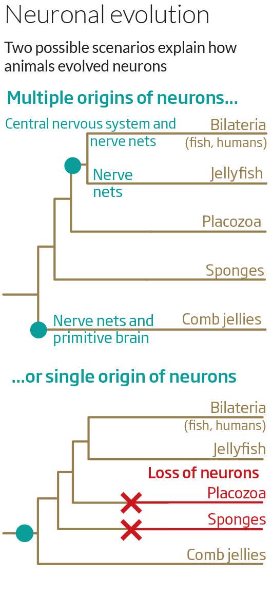 This single origin scenario offers a tidy explanation for why some animals, like sponges and flat, simple placozoans, still don’t have neurons: they must have branched off before these evolved and are relics of ancestral animals (see diagram).