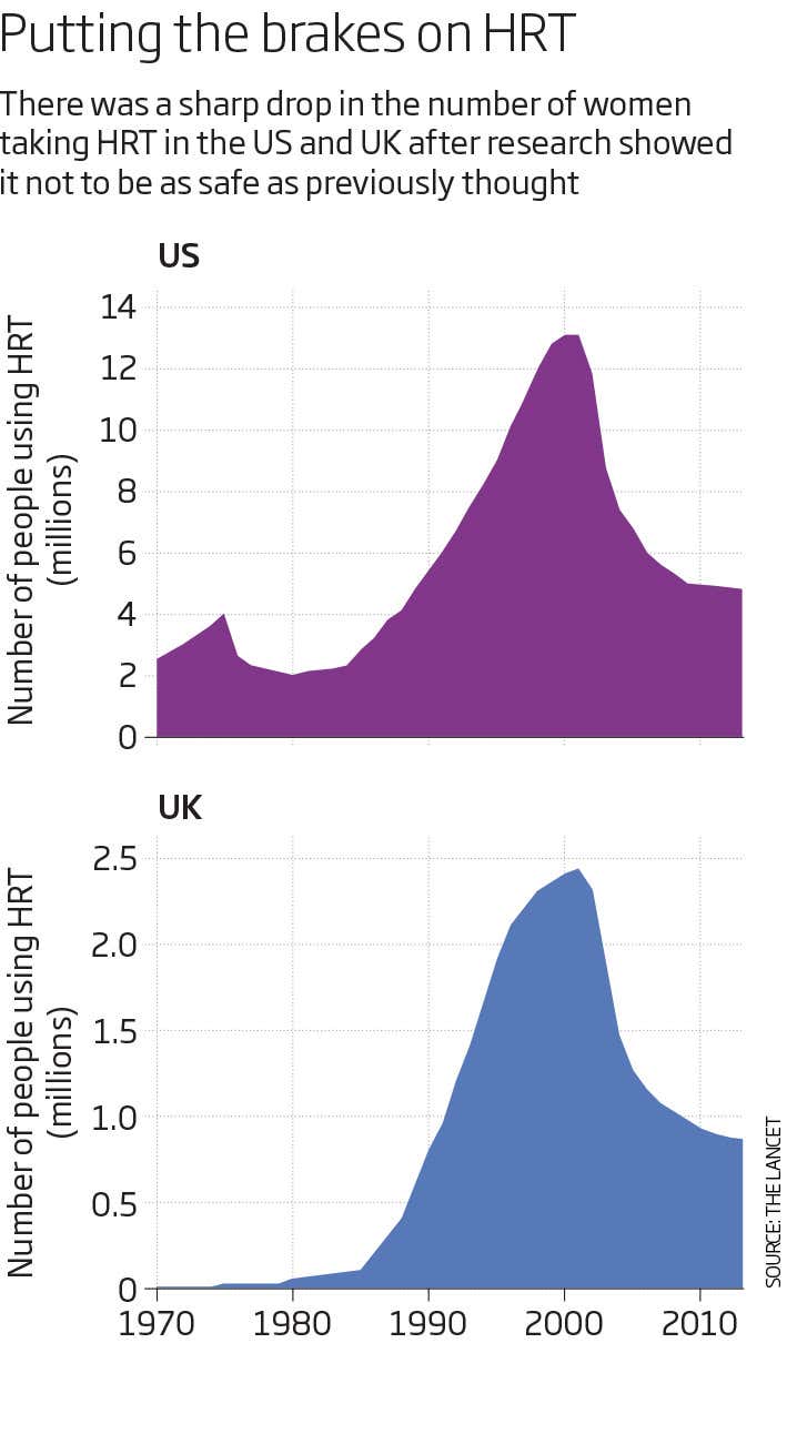 That all changed when, in 2002, the Women’s Health Initiative, one of the biggest studies on the safety of HRT, showed that the treatment was not protective and might actually raise the risk of heart disease and breast cancer. The number of women using it dropped dramatically as a result (see graph). Around 6 million women take HRT in the UK and US at present.