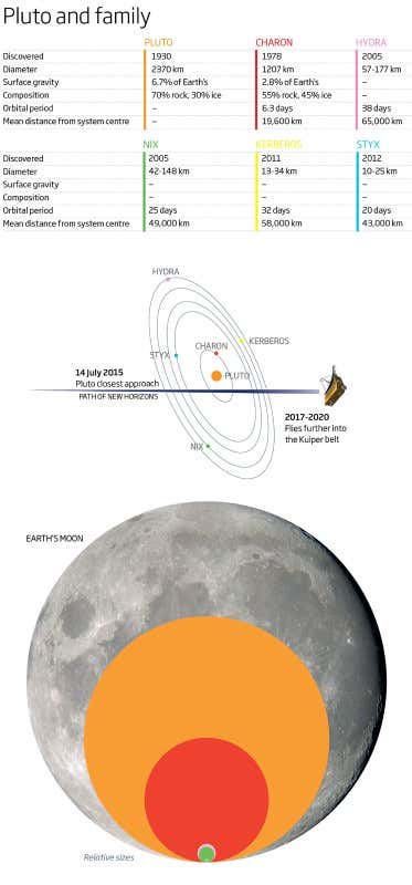 Ammonia has been found in the atmospheres of giant planets and in the plumes spouting from Saturn’s moon Enceladus, “but the only solid surface where we have identified ammonia in the entire solar system is Charon”, says Bill McKinnon of Washington University in St Louis, Missouri. New Horizons will find out whether there is enough to inject some activity into Charon’s landscape, perhaps lubricating geysers. “I want to see if there are flows of semi-solid ammonia water ice, or eruptions,” says McKinnon.