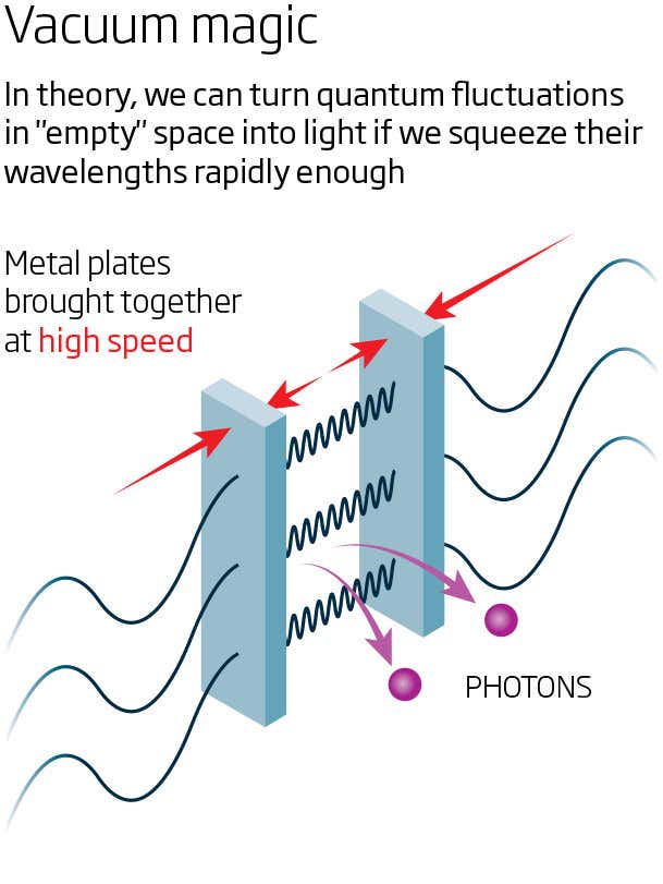 It’s a weakling force but it has been detected. And more recently, physicists like Chris Wilson, now at the University of Waterloo in Canada, have tried to prove another eccentric prediction: that it is possible to use the effect to release latent energy. Instead of allowing the fluctuations to tug on the plates, you rapidly force the plates together to squeeze their wavelengths – and force out photons (see diagram).