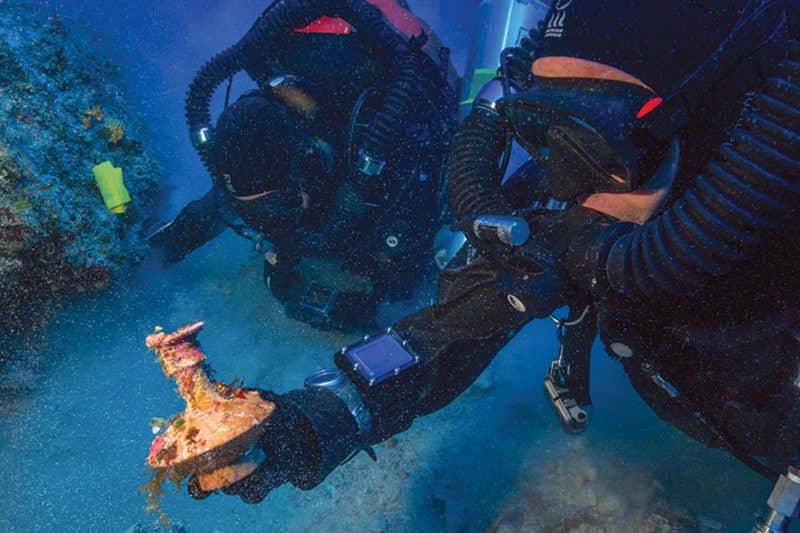 The first couple of weeks of the diving expedition yielded a slow stream of finds including ship components such as roof tiles and lead hull sheeting as well as finer items: sections of a bone flute, a blue game pawn and a statuette base. “These are prestige goods,” says Foley, “not the sort of thing you normally find on a wreck.”